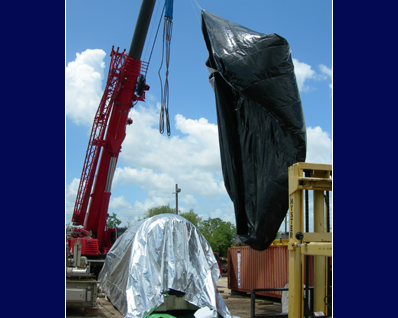 Our solution was to completely enclose the units in custom, six sided bags made of HD-100 material. To make the enclosure, we lifted turbines with a crane, then spread the material under them. We lowered the turbines onto the material and added desiccant as an extra corrosion prevention measure. We pulled the material up and around the turbines making seals with hand held rotary heat sealers. The final component of the solution was a heavy duty reinforced cover to help further protect the unit from UV damage and debris. We lowered the reinforced cover over the units with the aid of a crane and secured the cover with grommets we had added along the edges.